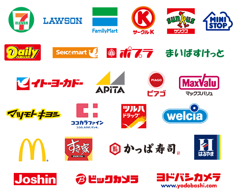 コンビニ、スーパー、ドラッグストアなど、いつものお店で使えます。